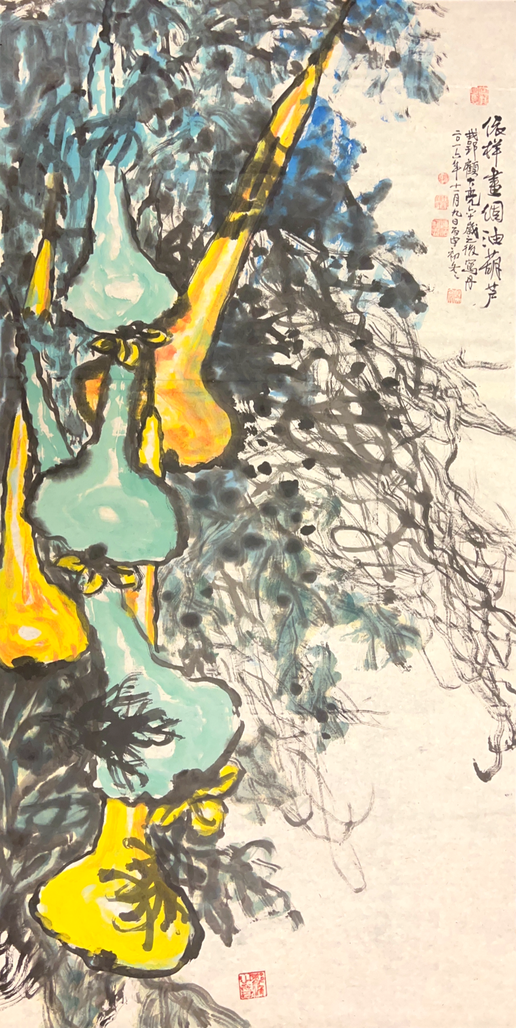 顾亮先生的中国画个性鲜明,以六大特点立于中国画坛:一是创意大胆清新,意境险峻古拙。二是线条自然老辣,逆笔取势,遒劲灵动,技法熟而后生。三是墨彩浑融,亮丽鲜活。四是融合农民画和版画特点,充满童心,意趣天成。五是创造履带皴法、鼓点皴法和青花中国画,具有律动韵味,让人眼前一亮。六是内涵丰富,人文性强,题跋时出新奇,引人入胜。总之,顾亮先生的画意境美、墨彩美、线条美、技法美、造型美、情趣美、风格美和内涵美。靓丽清新,魅力四射,非常养眼,让人百看不厌。