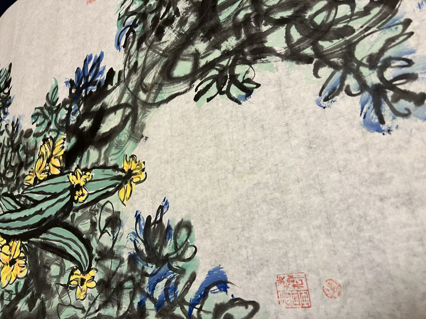 顾亮先生的中国画个性鲜明,以六大特点立于中国画坛:一是创意大胆清新,意境险峻古拙。二是线条自然老辣,逆笔取势,遒劲灵动,技法熟而后生。三是墨彩浑融,亮丽鲜活。四是融合农民画和版画特点,充满童心,意趣天成。五是创造履带皴法、鼓点皴法和青花中国画,具有律动韵味,让人眼前一亮。六是内涵丰富,人文性强,题跋时出新奇,引人入胜。总之,顾亮先生的画意境美、墨彩美、线条美、技法美、造型美、情趣美、风格美和内涵美。靓丽清新,魅力四射,非常养眼,让人百看不厌。